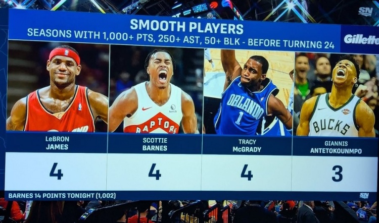 根据数据统计,加上本场比赛,斯科蒂-巴恩斯本赛季的得分已经突破1000分。生涯至今他已经4次做到单赛季得分1000+助攻250+盖帽50+,他追平詹姆斯和麦迪,成为25岁前单赛季得分1000+助攻250+盖帽50+次数最多的球员。
