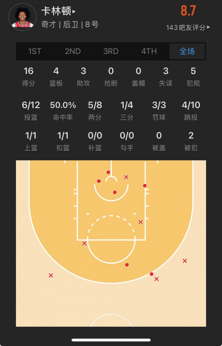 奇才14号秀 卡尔顿-卡林顿 登场27.3分钟