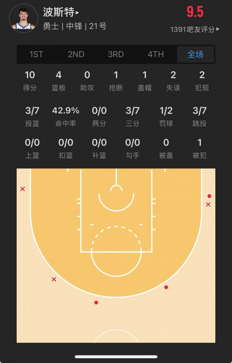 勇士52号秀 昆滕-波斯特 登场20.9分钟