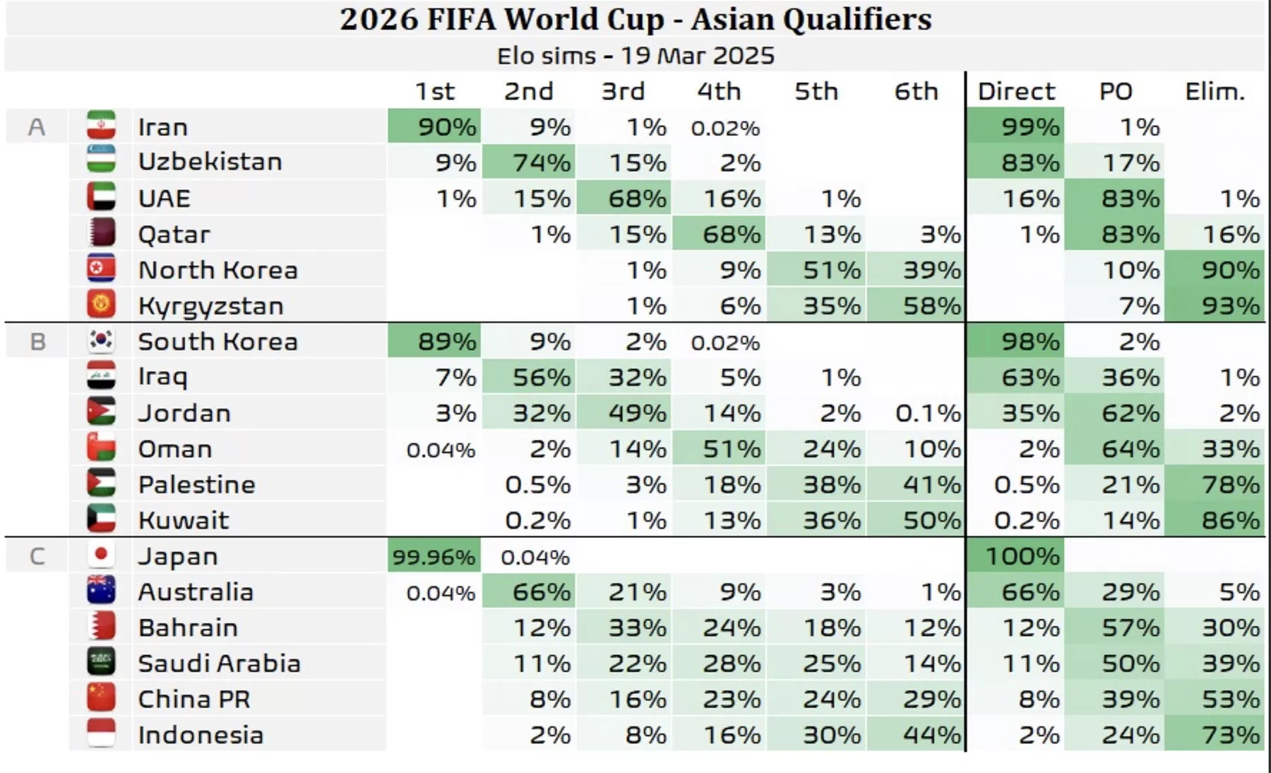 其中A组的伊朗(99%)、B组的韩国(98%)、C组的日本(100%)基本锁定了直通世界杯的名额。