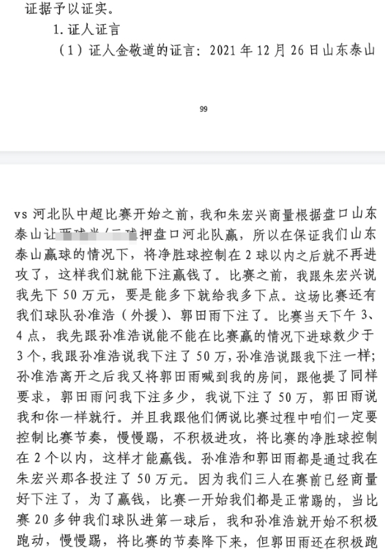 金敬道证言:踢河北我和孙准浩、郭田雨各下注50万,一起控制节奏